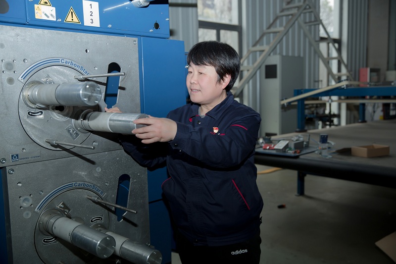 4月29日,這天上午,于素梅早早就來到了廠里,整理和打印為中復神鷹碳纖維公司高端碳纖維生產線設計的部分紡絲設備圖紙。她跟我說過:她對圖紙有感情。這我理解——1987年,大學剛畢業的于素梅被分配到連云港紡織機械廠(連云港鷹游紡機集團有限公司前身)技術科工作,從此她就立足技術崗位,扎根生產一線。在具體工作中,她以一個年輕技術員的身份,完成了燙剪聯合機、水洗機、磁棒印花機等10余種新產品的設計的主創研發。那時候,她干得最多的工作,就是畫圖。2005年公司重組后,于素梅從紡織設備的開發投身于碳纖維裝備與技術研發工作。當時,碳纖維屬于高性能纖維,在國外都屬于技術保密項目,而外國公司為了獲取更大的利益,只愿意高價出售產品,而不出售設備與技術。為打破國外碳纖維技術封鎖,董事長張國良稟持“為祖國爭光、為民族爭氣”的堅強信念,抽調于素梅等技術骨干專門攻克高性能碳纖維產業化難題。接下來,在兩個多月時間里,于素梅所在團隊畫了近萬張設計圖紙,不斷解決遇到的各種難題,終于打通了聚合、紡絲、碳化全部工藝流程,完成了年產500噸原絲生產線和年產100噸碳化生產線全部裝備的研制工作,形成了百噸級碳纖維的成套生產線,并于2007年5月首次連續生產出合格的碳纖維。正是在此基礎上,于素梅與同事們相繼完成多條碳纖維生產線,以及碳纖維預浸布的復合材料預浸設備生產線的設備的設計開發工作,實現了T300/ T700/T800級碳纖維及原絲設備的全部國產化、規?;a。她和同事們研發的“干噴濕紡千噸級高強/百噸級中模碳纖維產業化關鍵技術及應用”項目獲得2017年度國家科技進步一等獎。今天,她要根據圖紙指導工藝人員明確其中的關鍵零部件,以提醒其在編寫加工工藝時的注意事項??紤]到進口軸承供貨周期長,她又安排提前為采購人員提供設備中選用的進口軸承型號及數量明細表,方便其與供應商交流,避免因軸承交貨不及時影響設備裝配從而影響整個生產線的交付時間。就這樣說說做做,一個上午過去了。到了下午,她又開始了編寫中復神鷹公司購置的4米碳化線部分設備使用說明書工作。