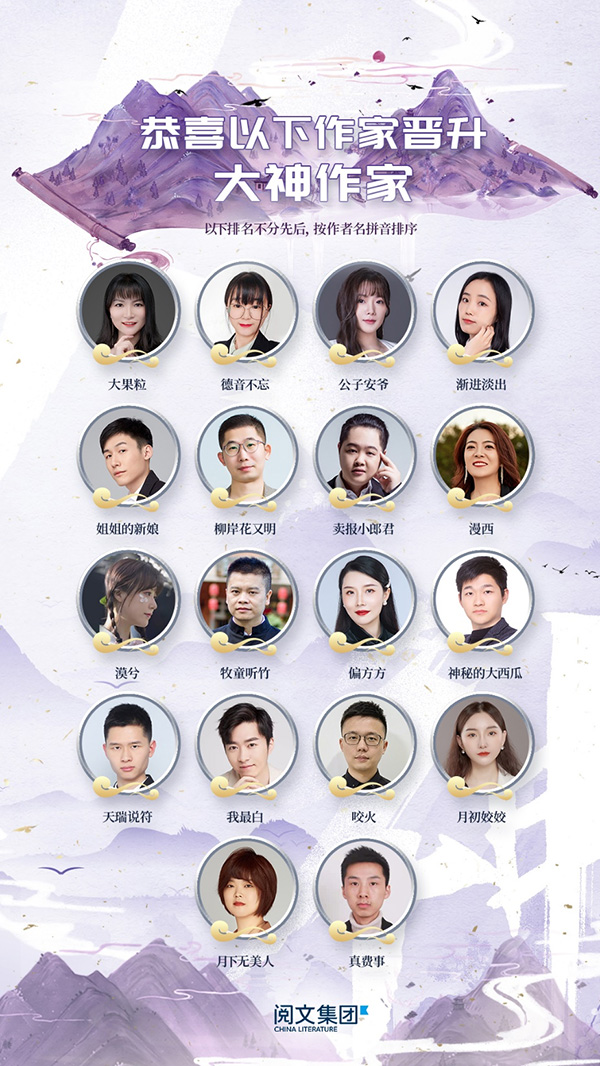 像天瑞說符這樣的新鮮血液,正越來越多地出現在“白金作家”和“大神作家”名單里?!鞍捉鹱骷摇焙汀按笊褡骷摇痹u選歷經十數年,堪稱網絡文學界的“封神榜”,它既是對作家優異成績的榮譽性認證,也是網文作家邁向峰頂的重要標志,已成業內含金量最高的頭部網絡作家榮譽頭銜。