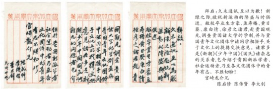 滔天長子宮崎龍介(1892—1971)畢業于東京帝國大學法學部,理解中國“五四”運動,與陳獨秀、李大釗有親密交往。龍介對日本的侵略政策一貫持批判態度,第二次世界大戰后為和平運動及日中友好運動做出了許多貢獻。在書中收錄的兩封李大釗在1919年10月寫給龍介的兩封親筆信中可知,那時五四運動剛剛過去五個月,李大釗曾多次邀請同在北京的龍介詳談,一次是去自己住處,一次是往假座香場六味齋。李大釗用毛筆或鋼筆寫信,所用紅線信紙上方一行印有“國立北京大學用箋”八字。在另一封李大釗聯名陳啟修、陳傳賢在1920年春寫給宮崎龍介的信中,李大釗向宮崎龍介介紹北京大學的幾位學生去日本調研,希望龍介能介紹日本的革命青年和進步學者相識,在信中李大釗飽含熱情地祝愿并與之分享“新運動的隆盛”。時隔不久,陳獨秀也給宮崎龍介寫信,希望已經回到日本的他可以幫忙介紹照顧友人,信中陳獨秀提到去年(1919年)在北京兩人曾相談甚歡。