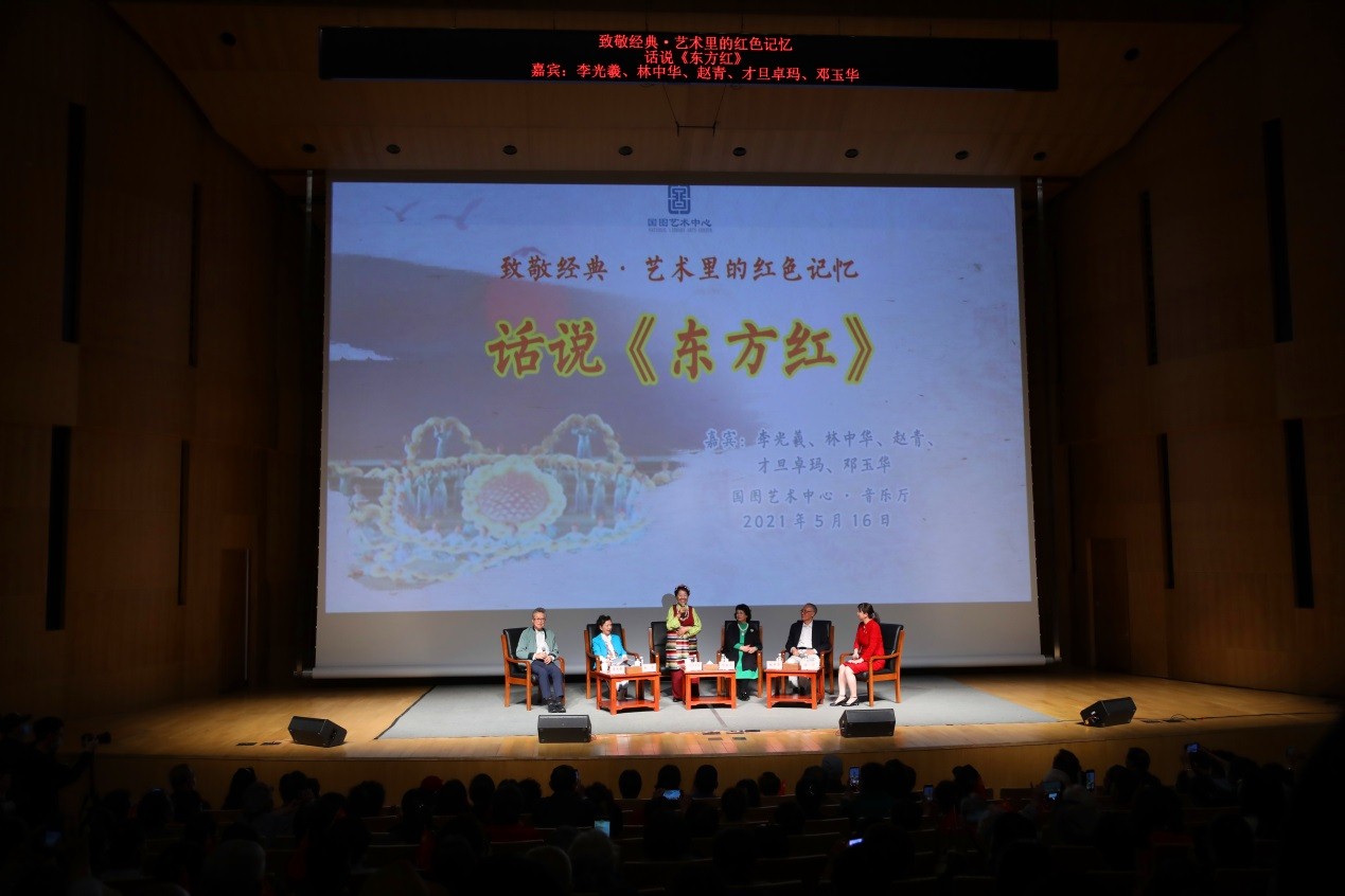 為慶祝中國共產黨建黨100周年,5月16日,“致敬經典·藝術里的紅色記憶”系列公益活動第二場暨首場文化沙龍“話說《東方紅》”在國家圖書館藝術中心舉行。當年參與大型音樂舞蹈史詩《東方紅》演出的李光羲、林中華、趙青、才旦卓瑪、鄧玉華五位老藝術家受邀參加活動,以對話形式分享了經典巨作《東方紅》創作、排練、演出背后的故事。