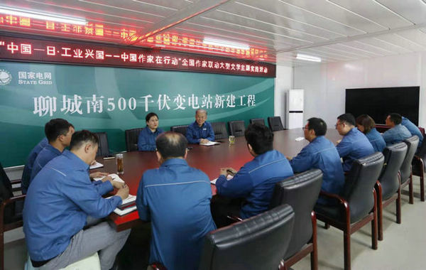 在此次實踐活動中,姜鐵軍深入山東省電力公司聊城南500千伏變電站進行采風采訪。聊城南500千伏變電站是山東省電力公司向建黨100周年獻禮電力工程項目,也是“十四五”山東省第一個建設的500千伏變電站。通過座談交流、現場采風采訪等方式,姜鐵軍用生動的筆觸展現電力工人的辛勞與風采。他在此次創作的紀實散文《送變電人的勞動節》中寫道:“站在已經安裝好各種變壓設備的場地里,我仿佛又看到了熱火朝天的打樁場面,猶如一場沒有硝煙的激戰,送變電人就是沖鋒陷陣的戰士。這些忘我勞動的送變電人,這些擔責奮進的送變電人,這些爭分奪秒的送變電人,在這塊土地上寫下他們的風采!”