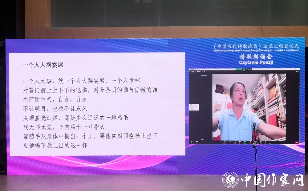 5月18日下午,由中國作家協會、中國駐波蘭大使館、波蘭對話出版社共同主辦的《中國當代詩歌選集》波蘭文版首發式暨詩歌朗誦會在北京紅樓公共藏書樓以線上線下結合的方式舉行。中國作協副主席、書記處書記吉狄馬加,中國駐波蘭大使館文化參贊張中華出席活動并致辭。中國詩人湯養宗、胡弦、陳先發、張執浩與本書譯者,波蘭漢學家、翻譯家李周、卡塔基娜·薩雷克,波蘭對話出版社總經理安德烈·帕西米斯等通過視頻連線方式共襄詩歌盛會。朗誦會由中國作協外聯部負責人張洪斌主持。