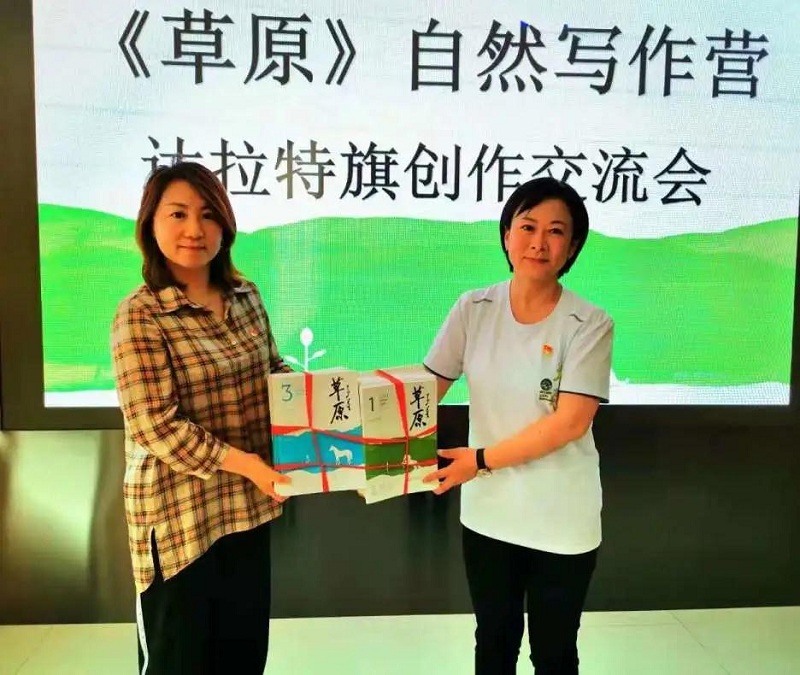 當日下午,自然寫作營的作家與達拉特旗本土作家共同走進興達陽光集團,參觀了企業黨建館,回顧黨的光輝歷程,接受了一次生動的黨史教育。之后與達旗本土作家們進行座談,就自然寫作的理解、創作感受等展開交流。座談中,《草原》主編及編輯表示將一如既往地關注基層作者,加大對基層作者的扶持力度,希望大家以此次自然寫作營為契機,走進廣袤的自然,從自然與生活中汲取文學創作營養,多出精品。會上,內蒙古文學雜志社與達旗文聯互贈了《草原》雜志和《長河》雜志。