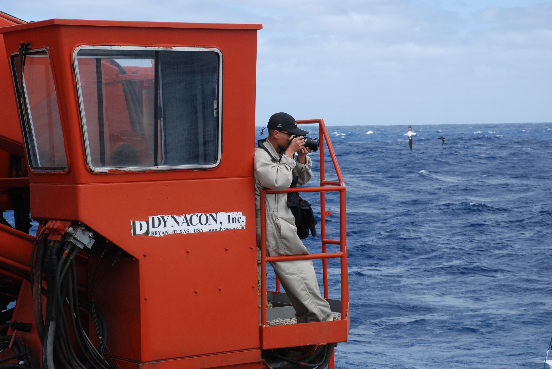 大洋一號船搭載著科考隊員在西南印度洋開展科考,作者登上船尾吊車記錄科考過程,遠處的海鳥時刻注視著船邊泛起的浪花,那里時常有它們愛吃的飛魚一躍而出。
