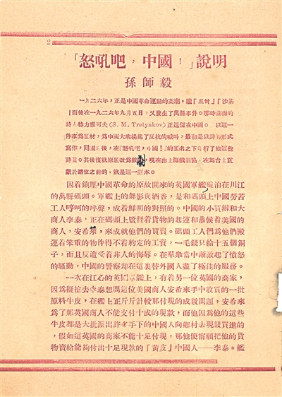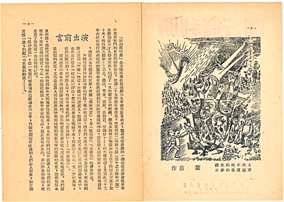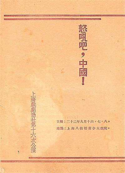 他所收集來的演出說明書中,有些劇目對當時的歷史和戲劇都提供了珍貴的研究價值。比如《怒吼吧!中國》是上世紀30年代左翼戲劇的一部重要作品,由蘇聯詩人特力雅可夫根據英美軍艦在四川萬縣迫害中國百姓的真實事件改編。他以詩的形式寫作,后由上海戲劇協會搬上舞臺。但在日軍占領上海后,當局為動員民眾將其改編為《江舟泣血記》?!督燮洝费莩稣f明書顯示,該劇曾在大光明戲院組織了演出。上海解放后,人民政府組織的第一次大規模演出也正是此劇,演出地點在文化廣場。