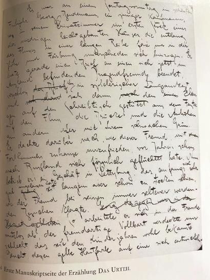 “我在22日(1912年9月22日——筆者注)夜里開始寫《判決》這個故事,一口氣寫到23日早上6點。我從書桌下艱難地挪出因久坐而變得僵硬的雙腿。心力交瘁的感覺,還有看著故事在眼前漸漸展開的快樂,像在水中不斷向前泅行。在這個夜里,我多次用我的脊背扛起全身之重。什么都義無反顧了,我為所有的一切,為那些最陌生奇怪的念頭準備了一把大火,目睹它們在火里滅亡和復活?!?/p>