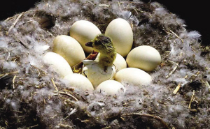 2001年5月,在青海湖鳥島潛伏的葛玉修,發現一個鳥巢的9個蛋中,有個蛋裂開了一個小洞,里邊還傳出“嘰嘰”聲?!半r雁即將出殼”,想到這里,葛玉修悄然隱蔽地趴在雁巢附近,忍著烈日的蒸烤和撲鼻的鳥糞臭,耐心等待4個多小時,終于拍到雛雁出殼的全過程。而后,他又陸續拍到雛雁學步、涉水的鏡頭,最終形成組照《生命禮贊》,作品在黃河流域九?。▍^)藝術攝影展中獲得金獎。