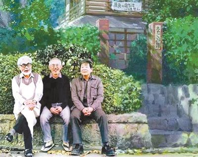 穿過展廳的大門,迎面一幅放大的照片,三位老者坐在花壇前,他們是1985年創立吉卜力工作室的核心班底:宮崎駿、鈴木敏夫、高畑勛。迄今為止,他們合力出品了21部動畫長片。三人身后是一座濃密的爬山虎覆蓋下的小樓,原來是手繪而成的吉卜力工作室最初的外觀。將三位元老與自己心愛的工作地點合成在一起,無疑成就了他們的心愿,也是令全世界動畫迷不勝感慨的情景。
