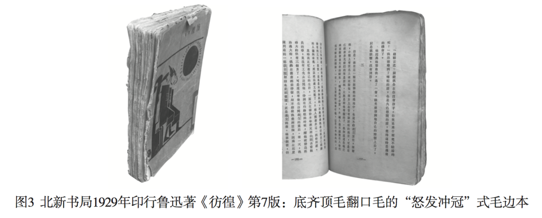 其實,《域外小說集》的三面毛邊、“新潮社文藝叢書”的書根書口毛邊是沿襲歐式及日式書裝的正統形式,而“怒發沖冠”式毛邊本卻是中國新文學出版自我實踐中的發明(“怒發沖冠”式毛邊本見圖3)。對于中式毛邊改制的原因,唐弢先生解釋為:“記得魯迅先生說過,洋裝書是直插的,用硬封面,毛邊在書根不受影響。中國尚沒有全用硬面精裝的條件。線裝書宜于橫放,向來的習慣是將書根磨光,寫上書名,以便隨時查閱。過去還有以寫書根為業的專門人才呢。何況舊式書箱很多是按橫放設計的,書根朝外,倘不加工,將只見到亂糟糟的一堆?!?9這是一個很有想象力的倒推:書籍被陳列、閱讀的方式反向影響了它被生產的樣式,“怒發沖冠”式毛邊切光書根是中國線裝書軟包造成的書籍橫放、書根向外露出習慣無意識的遺留,更值得玩味的是,我們就此抓住一只馬腳——看似創新的毛邊本,實則包含著線裝書使用習慣在洋裝書一隅的復活。那么,現代的毛邊書所繼承的是線裝書怎樣的形式經驗?