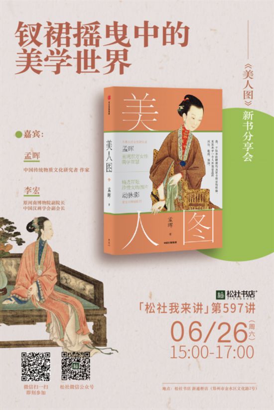 孟暉的最新作品《美人圖》,不僅聚焦在古代人的衣飾之上,更揭示出古代女子是如何匠心獨運,把美學智慧運用到衣食住行的各個層面上的。本周六下午,她將做客松社書店,與李宏老師一起,講解“釵裙搖曳中的美學世界”。