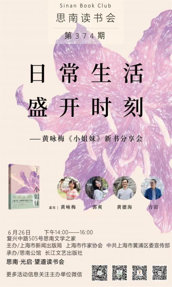日常的艱難與困頓,內心的遠方與渴望,在黃詠梅的小說中,常常構成一個外與內并行的雙線條敘事,讓她筆下的日常生活,顯得浩大且舒朗,好似激烈又熱忱的小姨,執著又敏感的女作家,游移又堅韌不拔的父親……我們難以為黃詠梅筆下的故事固定一個面貌,我們只能說,這是生活本身。在逐漸拋卻性別色彩的二十一世紀文藝小說中,互聯網文化浪潮下,黃詠梅所代表的成熟氣質的女性作家們,正在試圖深入新世紀精神世界的遼闊之地,托起一個多變又堅決的世界。6月26日下午,黃詠梅將攜帶她最新的小說精選集《小姐妹》,和作家郭爽、評論家黃德海、方巖,共同探討那些日常生活的盛開時刻。
