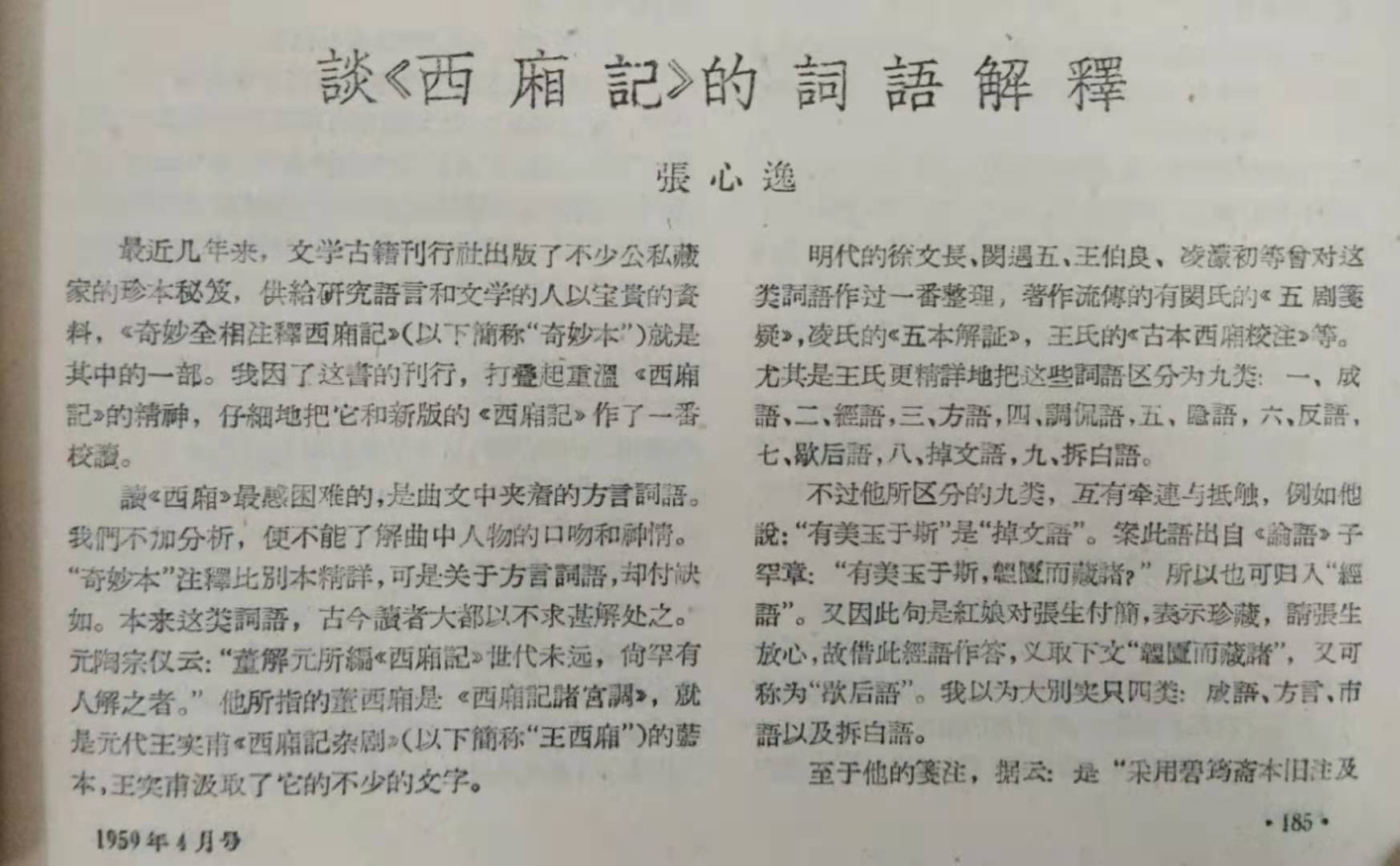 除了深入研討《劉知遠諸宮調》,在此前后短短數年間,張心逸還另發表了《談〈西廂記〉的詞語解釋》(載《中國語文》1959年第4期)、《古劇詞匯答問》(載《文匯報》1961年10月18日)、《新發現的〈明何璧校本北西廂記〉》(載《江海學刊》1961年12月)以及《〈元曲選釋〉補證》(連載于1959年至1962年《橫濱市立大學論叢》)等多篇論文,以語詞的考索釋證為主,兼及版本的調查勘驗,同樣得到不少同行專家的褒揚稱引。