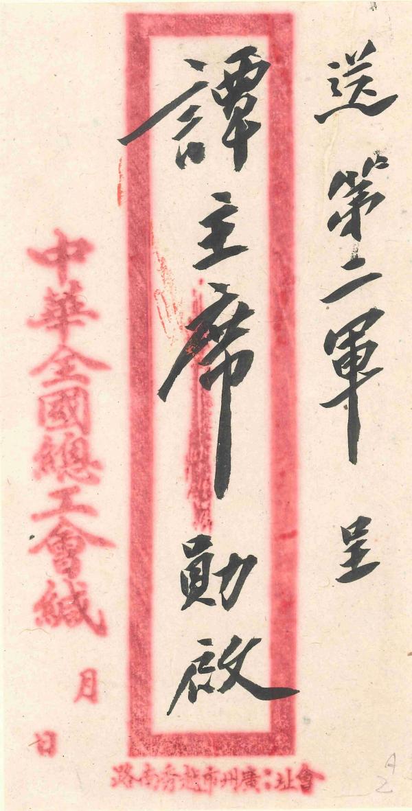 該札封套正中墨書“送第二軍呈譚主席勛啟”,封左下印有“中華全國總工會緘”,作扁體關防字樣。