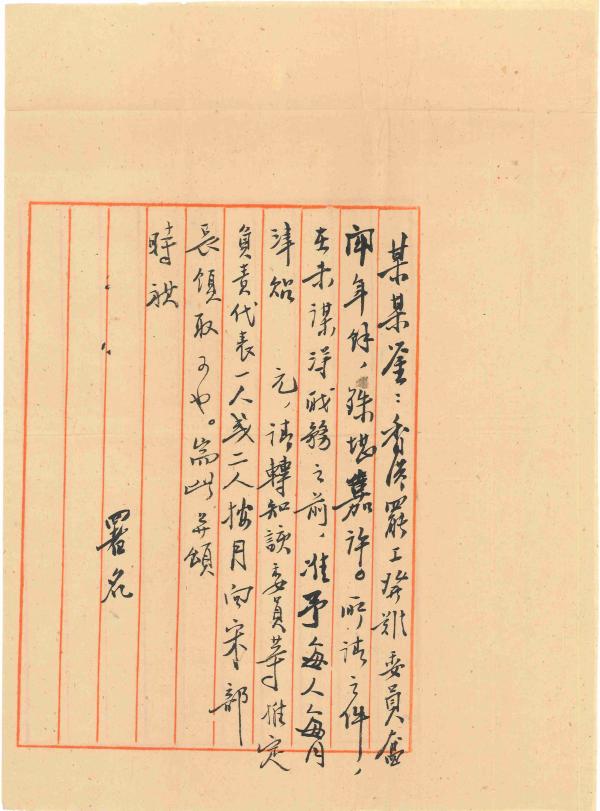 香港罷工發難委員奮斗年余,殊堪嘉許。所請之件,在未謀得職務之前,準予每人每月津貼囗元。請轉知該委員等推定負責代表一人或二人按月向宋部長領取可也,端此并頌時祺。
