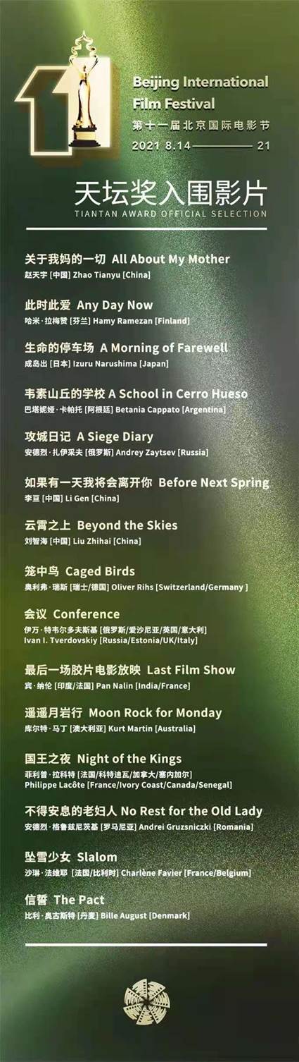 北京國際電影節組委會面向全球,征集2020年1月1日以后出品的優秀影片,其中國外影片12部,國內影片3部。分別是:中國影片 《關于我媽的一切》、 芬蘭影片《此時此愛》、 日本影片《生命的停車場》、阿根廷影片《韋素山丘的學?!?、俄羅斯影片《攻城日記》、中國影片《如果有一天我將會離開你》、中國影片 《云霄之上》、瑞士/德國合拍影片《籠中鳥》、俄羅斯/愛沙尼亞/英國/意大利合拍影片《會議》,印度/法國合拍影片《最后一場膠片電影放映》、澳大利亞影片《遙遙月巖行》、法國/科特迪瓦/加拿大/塞內加爾合拍影片《國王之夜》、羅馬尼亞影片《不得安息的老婦人》、法國/比利時合拍影片《墜雪少女》、丹麥影片《信誓》。