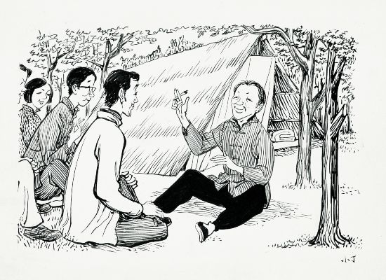 惲逸群同志曾多次在草寮的空地上給大家講“蔣家王朝”的丑聞,內容生動而且形象,似乎他講的每樁事情,都是他親眼目睹的。(丁聰《東江百日雜憶》,組畫)