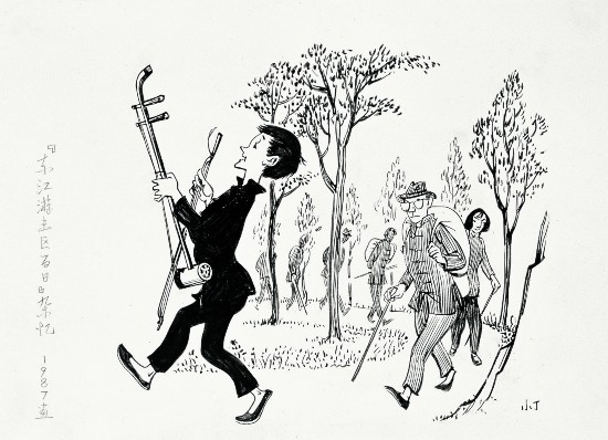 有一次轉移住址,領路的是個“小鬼”,不知他從哪里找到一把二胡,樂得他一路走一路拉,不成曲調的琴聲,不停地“伴奏”著那一次的行程。(丁聰《東江百日雜憶》,組畫)