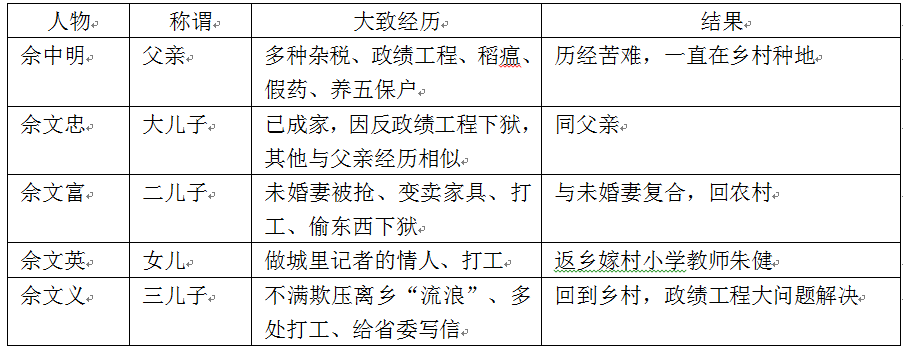 賀享雍在敘事視點的選擇上與趙樹理高度一致。他的小說采用鄉村內部視點,意味著拒絕“啟蒙式”的外部視點?!皢⒚烧摺痹谫R享雍的小說中會時時感到來自鄉村的“凝視”,這樣的有了某種“自主性”的鄉村,似乎有些讓外來者恐懼,因為他們看到的不是柳青式被外來者表述的“馴服化”鄉村。賀享雍小說最厚重的是《蒼涼后土》和《土地之癢》,展示了農民對土地的最深沉的眷戀,兩部小說的敘事視點都一直在農民那兒,和趙樹理的敘事建構一樣;而且賀享雍的農民都不是“個體”,而是群體,他們很少有“成長”的痕跡,而是以個體代群體式的生存,小說集中描述農民在各種環境下的生存與掙扎,他們以土地為根,應對所有的苦難。如《蒼涼后土》中老農民佘中明一家是敘述的焦點,幾個兒子作為家族的分支把鄉村的掙扎伸展到中國社會的各個領域?!渡n涼后土》中一家兩代人的苦難經歷見下表。