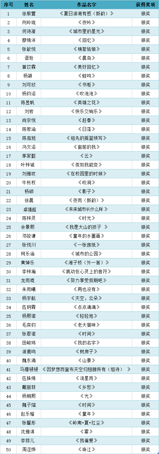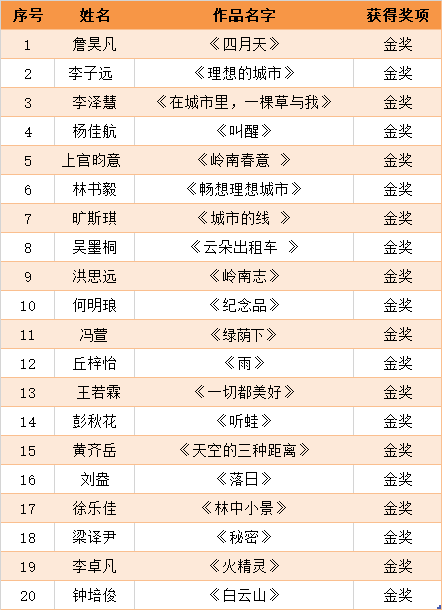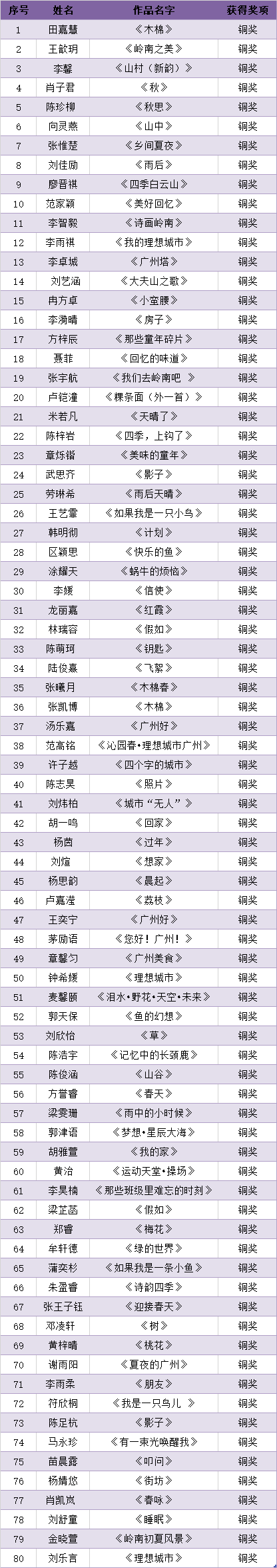 首屆珠江兒童詩歌獎以“理想城市”“美好回憶”“嶺南風物”為主題,廣泛向國內16歲以內的少年兒童征集現代詩和舊體詩。截止2021年6月1日,共收到參賽作品700多件。經評委初評,共有170個作品進入復選(網絡票選)。最終,結合網絡票選結果和評委意見,終評出金獎20名、銀獎50名、銅獎80名、網絡最佳人氣獎20名。