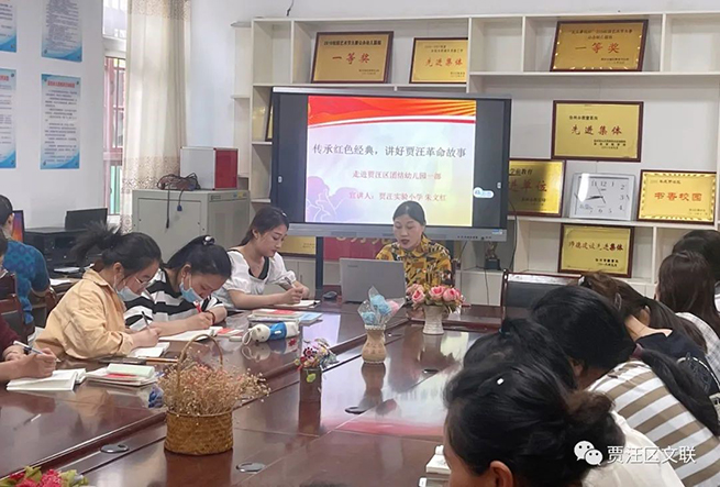 “百年礦夢紅色賈汪”宣講還走進了江蘇省徐州市賈汪區團結幼兒園,由區作協會員朱文紅為老師們宣講《運河支隊》。 運河支隊是中國共產黨領導的一支敵后抗日武裝,它馳騁蘇魯交界、馬踏運河兩岸,在抗日烽火中譜寫了一曲曲可歌可泣的英雄篇章。