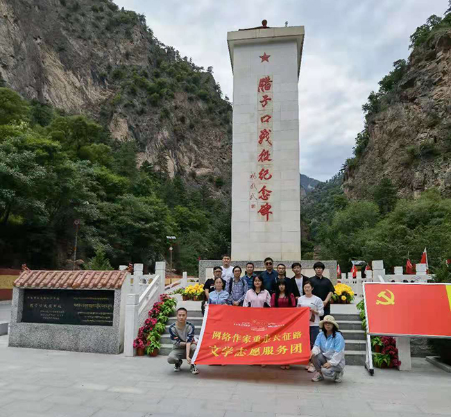 網絡作家重走長征路文學志愿服務團在臘子口戰役紀念碑前合影