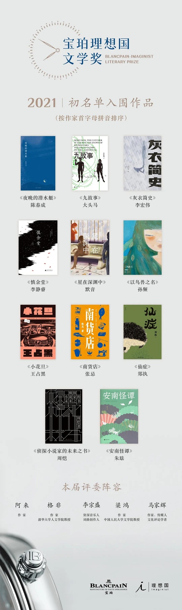 寶珀理想國文學獎由瑞士高級制表品牌BLANCPAIN寶珀與中國最具影響力的出版品牌理想國共同發起,是華語文學領域首個為發掘和鼓勵45周歲以下的優秀青年作家,由商業品牌與出版社聯合創立的獎項。寶珀理想國文學獎的設立,是為了讓大眾真正感受到“讀書,讓時間更有價值”。9月15日,文學獎評獎辦公室將依據評委多數表決出的作品,公布最終入圍決選名單的5部作品,敬請期待。
