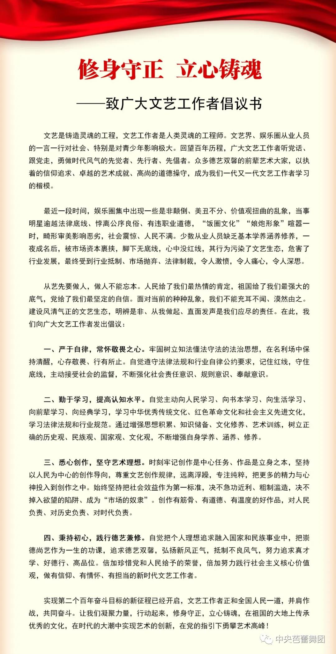 中央芭蕾舞團全體藝術家積極響應中國文聯《修身守正 立心鑄魂——致廣大文藝工作者倡議書》
