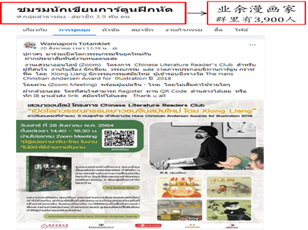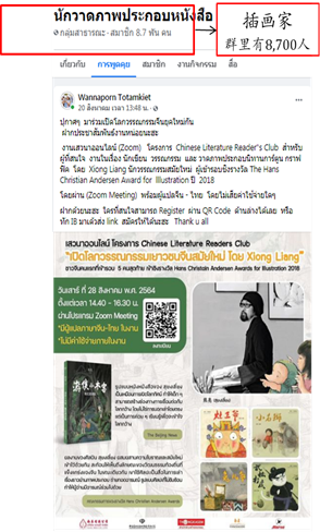 活動進行過程中,在線讀者紛紛留言,對熊亮的作品給予了高度評價,并希望熊亮的作品可以走進泰國,讓泰國讀者切身感受其中的神秘世界,促進中國童書走進海外市場?;顒右驳玫搅颂﹪妒澜缛請蟆贰秮喼奕請蟆返戎匾埫降臓幭鄨蟮?。同時,在Facebook等社交平臺上設立了多個粉絲群組,粉絲高達8600人。