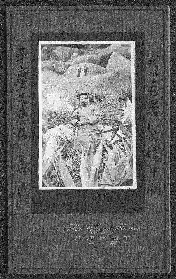 1927年1月2日攝于廈門。魯迅對廈門大學的人際關系感到厭煩,且不適應當地生活,不足半年就決意離開。臨行前,魯迅、林語堂與幾個學生在南普陀寺西南的小山崗上照相,這里到處生長著魯迅喜愛的龍舌蘭,滿山是饅頭一樣的洋灰的墳墓。魯迅寫信給許廣平說:“今天照了一個照相,是在草木叢中,坐在一個洋灰的墳的祭桌上”。魯迅后來把照片用在雜文集《墳》中。他還在照片上題寫“我坐在廈門的墳中間”贈給章廷謙(矛塵)。照片上標有:The China Studio, Amoy(廈門中國照相館)。