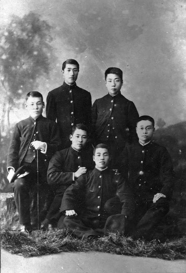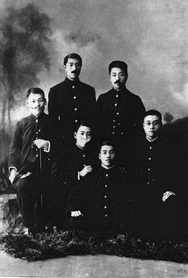1905年秋攝于日本仙臺。魯迅與同住在“宮川宅”公寓的五名住宿學生在仙臺東一番丁照相館合影。前排左起:三宅、磯部浩策、吉田林十郎、施霖;后排左起:大家武夫、魯迅。這張照片是魯迅贈給公寓主人宮川信哉留念的。八年后的1913年,當時照片中的一個人回來拜訪房東宮川信哉,宮川想象其中三人拍完照片十年后的樣子,為他們添上了胡子。他還在照片的背面寫道:“明治三十八年X月影,拾年后想象髪,大正二年現在,大家君在美國,周君不明,三宅君在大學小兒科,磯部君在米澤縣,吉田君在朝鮮,施君不明?!保ā跋胂篌姟笔恰跋胂篦凇保春殻┑恼`筆。)