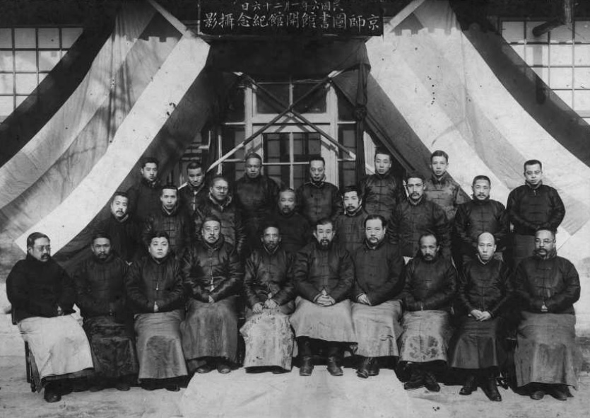 1917年1月26日攝于北京。圖為京師圖書館新館開館紀念合影。第二排左起第五人為魯迅,第一排左起第五人為時任北京大學校長蔡元培,第二排左起第四人為時任社會教育司司長夏曾佑。