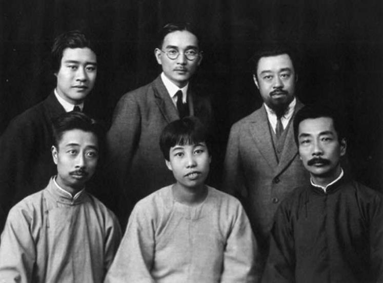 1927年10月4日攝于上海。魯迅到達上海與親朋好友合影。魯迅當日日記中記載:“午前伏園、春臺來,并邀三弟及廣平至言茂源午飯,玉堂亦至,下午六人同照相?!鼻芭庞移穑呼斞?、許廣平、周建人;后排右起:孫伏園、林語堂、孫福熙。值得一提的是,魯迅與林語堂原為好友,后交惡。在1977年文物出版社出版的《魯迅》照片集中,林語堂被抹掉了。在這張照片中,孫福熙與林語堂一同被抹掉。此外,林語堂還在另外兩張照片上也被抹去。