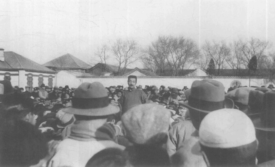 1932年11月27日攝于北京。1932年11月,魯迅赴北平探望母親期間,分別應北京大學、輔仁大學、女子文理學院、北京師范大學、中國大學之邀,發表了著名的“北平五講”。圖為魯迅在北京師范大學演講。在北師大的演講,起初在教室內,但聽眾甚多,只好轉到室外,大家把魯迅抬到方桌上。這一天演講的題目是《再論“第三種人”》。