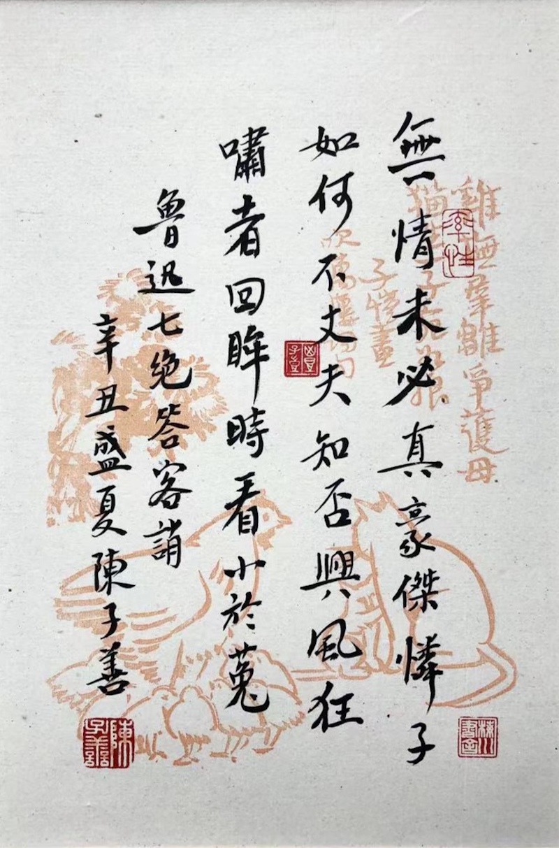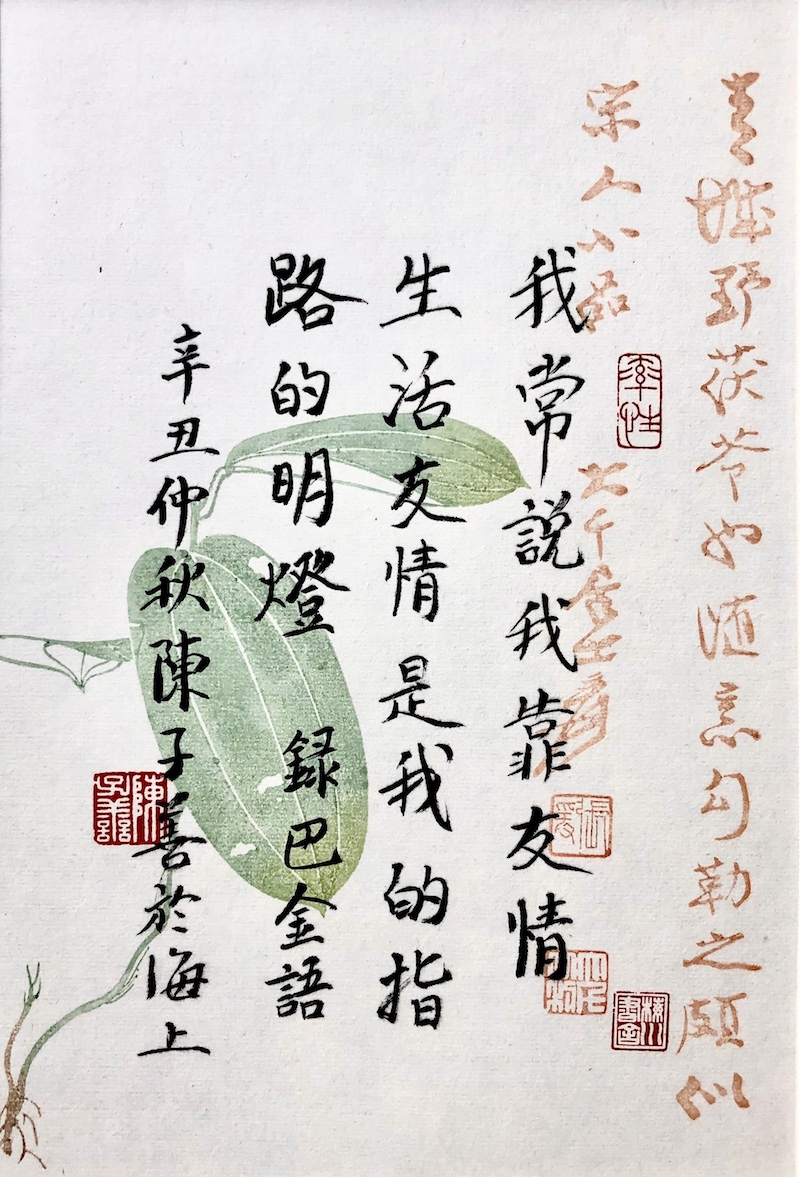 他帶給我們的最新驚喜,是這個世界上竟然會有一個“陳子善教授手錄新文學經典墨跡展”。但這次的驚喜又和以往有所不同,它以“出圈的節奏”挑戰了我對陳老師才能的想象力。陳老師怕我驚喜得找不著方向,就在微信里介紹說:“我這墨跡展,字不怎么樣,但自以為獨創一格的,是我只寫新文學名家的名言雋語,計有魯迅、胡適、周作人、郁達夫、徐志摩、梁實秋、林語堂、巴金、豐子愷、傅雷、張愛玲、木心等十二家的詩、對聯和警句。這是從未有過的,而且這些人也都是我研究過的……”我不禁揣想:陳老師對現代文學中這些人物星辰的感情究竟有多深不可測呢?他為這些人和書和文章以及與之有關的人和書和文章,獻了白天獻夜晚,獻了朝陽獻夕陽,獻了簡體獻繁體,獻了工作獻退休?,F在,又把墨跡獻出來了。