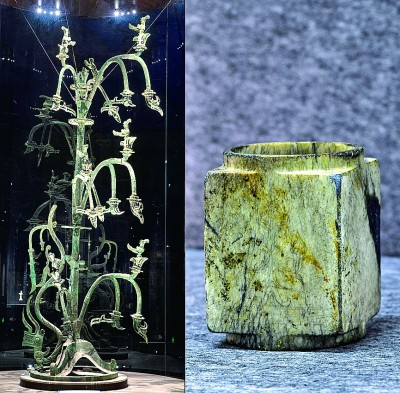 左圖:青銅神樹 右圖:刻有神樹紋的玉琮 新華社發