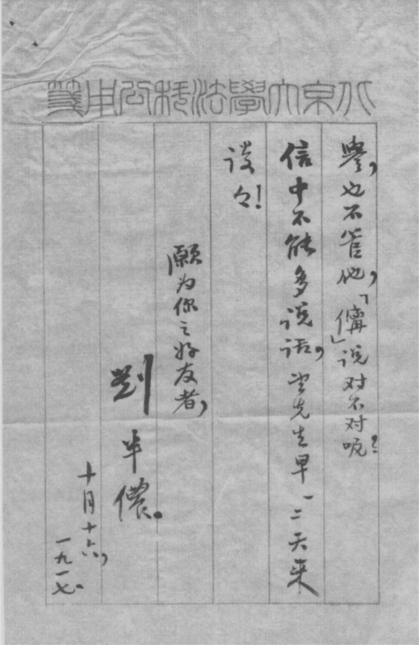 按:載北京魯迅博物館編《魯迅博物館藏近現代名家手札》(三),福建教育出版社2001年版,第210~214頁?;叶扔坝〖?。毛筆直行書寫,行書。凡五紙。信箋天頭印有“北京大學法科公用箋”篆字。