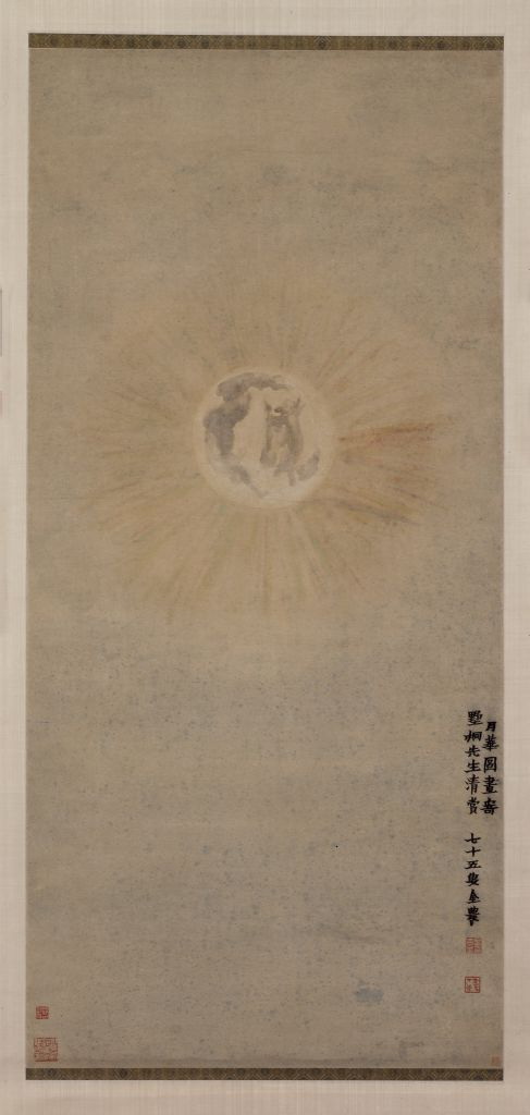 此圖是金農晚年畫贈友人之作。全畫中只有一輪滿月,里面是凹凸起伏的陰影,外緣放射出赤橙黃綠青藍紫組成的光芒,畫面賦色簡逸純凈?!对氯A圖》的構思則別出心裁,以寫實的手法直接表現月亮的光華,以奇致勝。此圖畫法上幾乎看不到傳統的筆墨之法,陰影的表現充分發揮了水墨在宣紙上產生的效果,與暖色調的淡色光芒形成對比,襯托出月光的皎潔明亮。張庚在《國朝畫征錄》曾評金農畫道:“非復塵世所見,蓋皆意為之?!贝藞D可謂前無古人,后無來者。