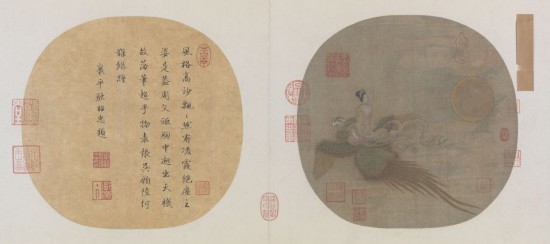 畫面中一鸞鳳于薄云淡霧中振翅飛鳴,其背上一仙女正茫然回首目視身后的一輪圓月。畫家將仙女回眸之一剎那所顯露出的悵惘之情刻畫的生動傳神,使本來單調的景物變得極富情趣并給人以想像力。在人物形象的塑造上,仙女的造型越出了隋唐時期仕女畫豐腴健壯的體態,表現出女性身材比例合理,造型勻稱的特點。