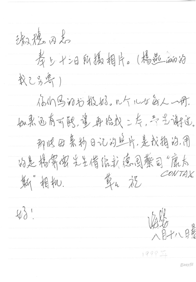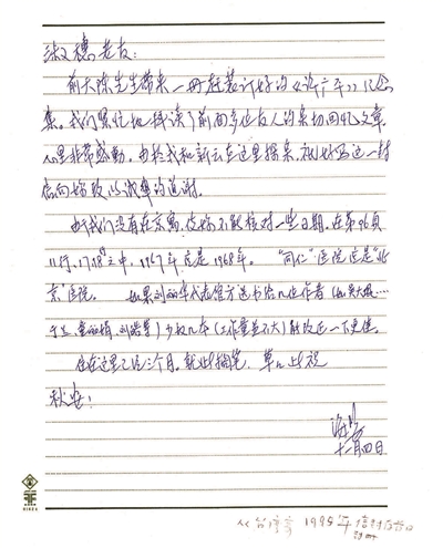 還有關于魯迅的棺木到底是誰買的等等,諸如此類的問題,海嬰同志都一一考證,求得史實的準確。再如為弄清“文化大革命”中魯迅手稿遭遇的真相,他曾到監獄去找戚本禹,也曾訪問過原北京衛戍區司令傅崇碧同志等等。他也曾非常仔細地多次糾正我寫的稿件中史實的不準確,如1995年我在紀念許廣平先生的《許廣平》一書中寫了一篇《難忘的恩澤 永遠的懷念》,海嬰同志在臺灣看到這篇文章中的錯誤,特意寫信給予糾正,信中寫道:“由于我們沒有在京寓,使妳不能核對一些日期,在第96頁11行、17、18行之中,1967應是1968,‘同仁’醫院應是‘北京’醫院”(見海嬰信1)等等,對于這些不準確的提法,他都從不放過。