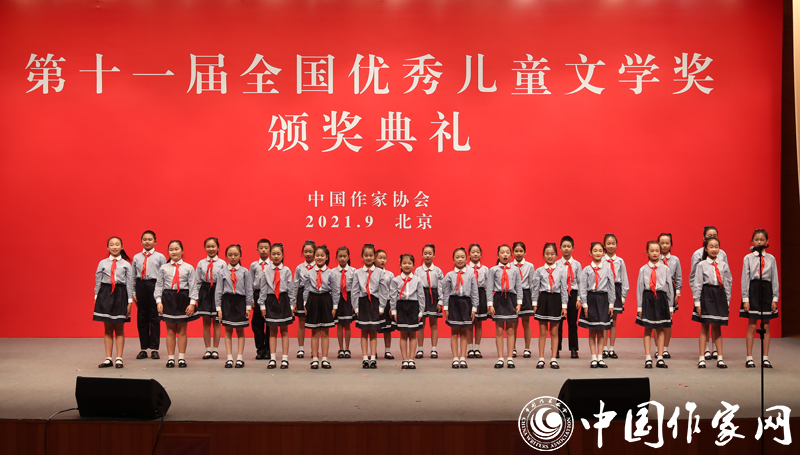 頒獎典禮上,來自北京朝陽實驗小學合唱團、少年國風室內樂團等的演員們帶來了精彩的演出。歌曲《童心向黨歌曲聯唱》《我們是共產主義接班人》《快樂成長》《心中國》等仿若天籟,宛轉悠揚。澄澈的目光,燦爛的笑容,經久的掌聲??作為對文學最好的饋贈,一起定格成這個秋夜最溫暖的記憶,新時代的中國兒童文學由此將踏上新的征程。