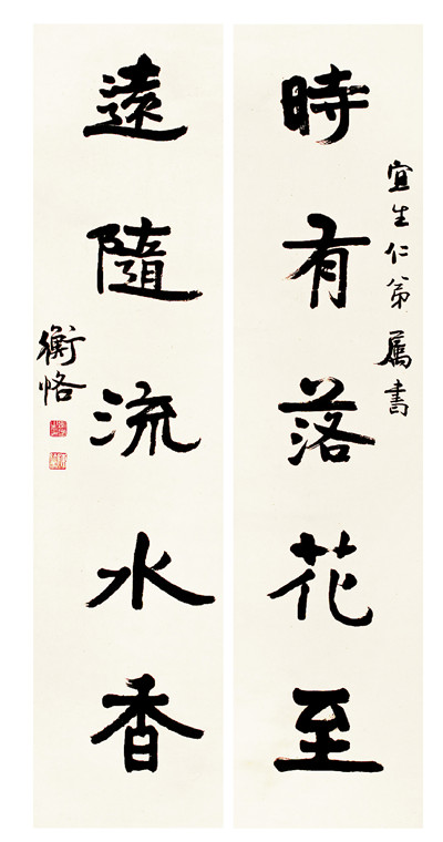 此為陳師曾對聯。陳師曾的書法宗漢魏六朝,上溯甲骨、鐘鼎、石鼓、秦篆,下逮漢隸、晉唐行楷等,幾乎無所不能。他的字有醇厚的氣息,且風神秀逸,蒼勁樸茂。人說他作書喜用狼毫禿穎,故線條蒼老剛健有雄渾之氣。而其篆隸書法,則深受吳昌碩的影響,尤其是石鼓文。但相對而言,陳氏書法結體平實,用筆含蓄收斂,沒有吳昌碩的夸張和霸氣。