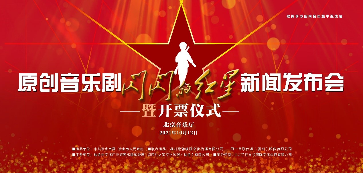 大型原創音樂劇《閃閃的紅星》由中共瑞金市委、瑞金市人民政府出品,深圳鼎瀚映畫文化傳播有限公司、同一首歌傳媒(贛州)股份有限公司聯合出品,由瑞金市文化廣電新聞出版旅游局、閃閃紅之星文化傳媒(瑞金)有限公司聯袂打造。首演將分兩地,10月28日、29日晚19:30在北京世紀劇院演出后,將在故事發生地、“共和國搖籃”瑞金市演出,并開始全國巡演。