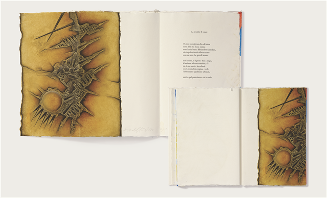 至于第三種類型,我愿意稱之為“樂隊類型”的藝術家手作書。這類創作通常由等量級的藝術家圍繞一個共同的主題聯合創作,比較強調參與者在藝術史地位、社會地位等層面上的對等。比如我收藏的一套由20世紀公認的意大利最著名的八位雕塑家聯合創作的作品《友誼之光》,是為了慶祝意大利國寶級藝術家阿納爾多?波莫多羅90歲生辰所作。