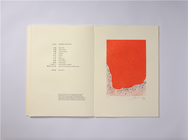 比如《書之極》中收錄的蕭勤作品《夜光杯》制作年代在2001年,對應的恰恰是藝術家創作階段中的“美麗新世界”時期。在66歲這個年紀,無論是藝術造詣還是創作心境,藝術家都已經從年輕時的躁動不安,升華到了一個恬靜淡泊、寧靜致遠的境界。在這個作品當中,蕭勤為每一幅版畫搭配了兩首中國古詩,從選題中不難看出,詩畫在意境表達上非常一致,體現了空靈、悠遠的感懷與大氣象。相對于以完全的虛空或以現實世界作為背景,蕭勤畫面最終的背景,是一個仿佛無限延伸,能夠容納所有物質及能量、表面空虛的“無邊能量感應場”。由此可見,經由一本藝術家手作書,透視一位藝術家一段時光中的藝術轍痕,生動可感,饒有趣味。