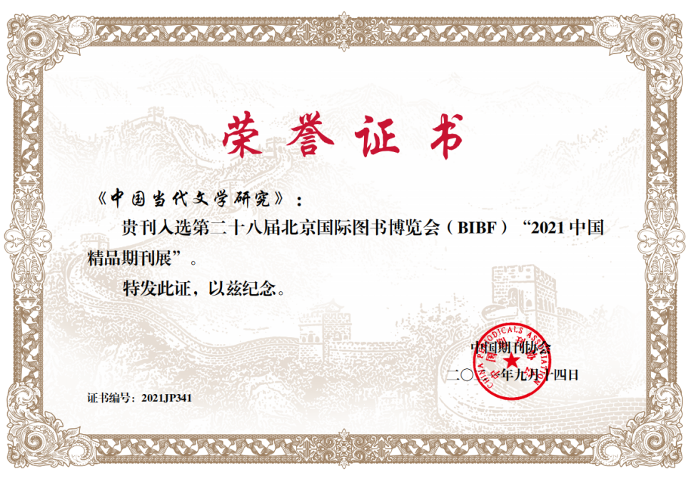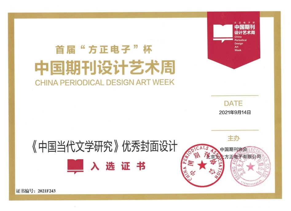 《中國當代文學研究》榮獲“2021中國精品期刊”和首屆“方正電子杯”中國期刊優秀封面設計獎