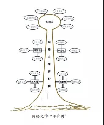 第三個層次是外圍層,即網絡文學影響力評價,它處于“評價樹”的末端。將影響力置于外圍和末端位置,并不意味著它不重要,而是以空間結構換取意義蘊含——影響力大小總是在一個事物完整出現后才能顯現出來,因而是一種置于時光之境的“后置延伸”效應,離開時間的后置將無從真正評價其影響力的大小,因為一時之“熱”并不能準確評判一個作品的價值,只有代代相傳的口碑,甚至隨著歷史發展而不斷增值的傳承,才顯示作品“永恒的魅力”亦即作品的影響力。另外,影響力評價是一種綜合評價,它不取決于某一個或某部分要素的“做功”情況,常常需要把當下的大數據指標評價與模糊綜合評價、數字人文集值統計評價、邏輯與歷史相統一評價等結合起來,才可能得出影響力的有效結論。故而,影響力評價就如同一棵樹開出的花朵或結出的果實,為網絡文學評價呈現出多彩的效果景觀。于是,我們便有了網絡文學評價體系的“樹狀”結構圖: