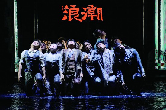 作品的張力還離不開舞臺的形式表達。導演對時空假定性的運用,借助電影中慣用的閃回、插敘、倒敘等語言顛覆了戲劇舞臺上線性的時間觀念,通過對時間的打碎、停頓、快倒等手段制造“陌生化”效果。還有對“浪潮”這一意象的空間營造,既通過對水元素的激情應用,也借助了現代舞語匯的肢體表達,這種舞臺手段的綜合,各種藝術元素的疊加,最終成就了一部超越革命主題、具有現代性審美價值的戲劇作品。