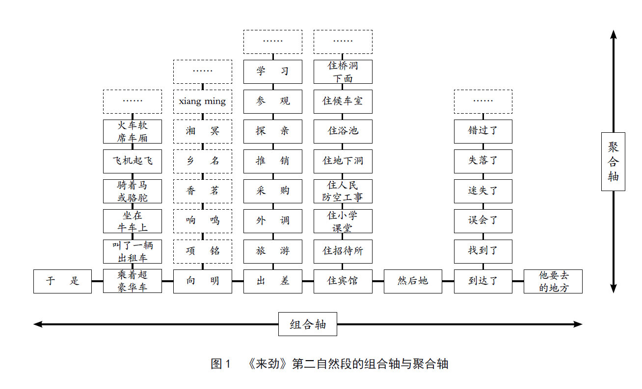 然而,聚合軸上的諸因素并置并非絕對混亂,我們仍能通過組合軸辨識出故事情節?!秮韯拧芬惨砸馑枷嚆5木渥映尸F人物多個可替代的謂語動作和所處情境,如第二段以無主語句描述了各種外出方式:“于是乘著超豪華車……好不容易叫了一輛出租車……坐在牛車上……騎著馬最好還是騎著駱駝……飛機起飛……火車的軟席車廂里……”26就在我們對諸多情境不明就里的時候,緊接著一句“向明出差、旅游、外調、采購、推銷、探親、參觀、學習……”27提示著我們,上面那段話的主語是向明,各種情境便是向明去出差、旅游等的所見所聞所感,最后“她到達了找到了誤會了迷失了失落了錯過了他要去的地方”28,不管是找到還是沒找到,都表明的是這個外出的結果。為了更清晰地把握文本信息,我們不妨以雙軸視角對《來勁》的第二自然段的內容作如下呈現(見圖1)。