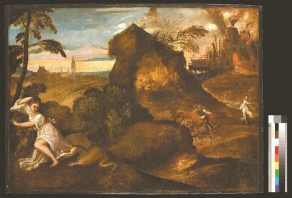 提香出奇的長壽,他活了88歲,活著的時候就獲得了潑天富貴,留下的作品很多,名聲也很大。此次展覽里,有一件提香的作品《俄耳甫斯與歐律狄刻》,幅面不大,可能讓一些沖著提香如雷貫耳大名頭來的觀眾,略略感到失望。不過我想在風景畫的發展脈絡上,來說說這張畫。