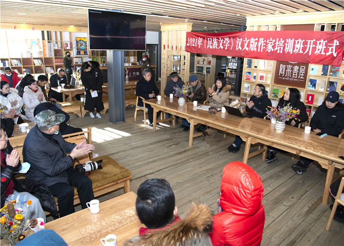 文學周期間,“2021《民族文學》漢文版作家培訓班”開班儀式在小金縣四姑娘山阿來書屋舉行。石一寧與阿壩州文聯副主席王慶九先后致辭,陳亞軍主持開班儀式。